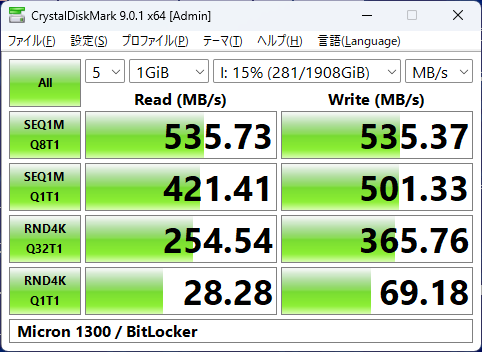 | データ SSD | 8 TB(2 TB+2 TB+4 TB) Micron 1300 MTFDDAK2T0TDL-1AW1ZABYY×2 ※2TB、S-ATA 3 (6Gbps)、2.5 インチ、3D TLC NAND、400 TBW Crucial BX500 CT4000BX500SSD1JP ※4TB、S-ATA 3 (6Gbps)、2.5 インチ、NAND 不明(TLC らしい)、1000 TBW |